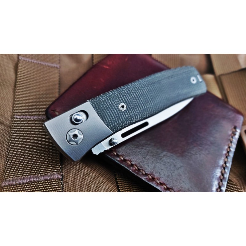 La lama in acciaio M390 con finitura satinata presenta perni del pollice rimovibili, così l'utilizzatore ha la possibilità di svitare i perni e utilizzare solo la scanalatura per l'unghia. Il Crossbar è un meccanismo di blocco che garantisce un utilizzo sicuro in qualsiasi situazione: è realizzato con due piastre parallele che si muovono insieme quando in azione e coprono sempre il foro, per evitare che lo sporco entri nella fessura.