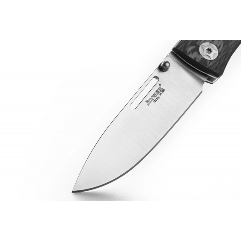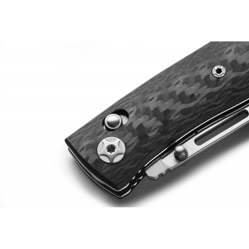 La lama in acciaio M390 con finitura satinata presenta perni del pollice rimovibili, così l'utilizzatore ha la possibilità di svitare i perni e utilizzare solo la scanalatura per l'unghia. Il Crossbar è un meccanismo di blocco che garantisce un utilizzo sicuro in qualsiasi situazione: è realizzato con due piastre parallele che si muovono insieme quando in azione e coprono sempre il foro, per evitare che lo sporco entri nella fessura.