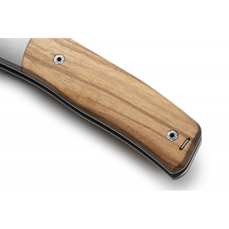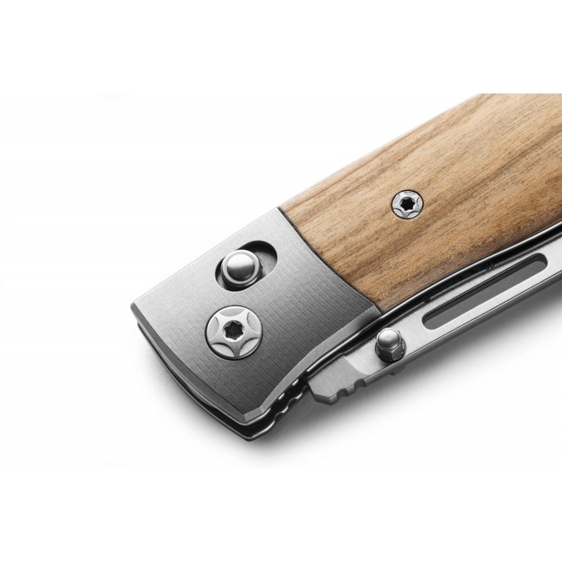 Il manico presenta una forma elegante ed ergonomica per una presa confortevole e un controllo senza sforzo. È disponibile in due varianti essenziali: con mostrina in Titanio sabbiato o senza, avendo quindi guancette più lunghe per tutta la lunghezza dei liner in acciaio inossidabile lucidato.