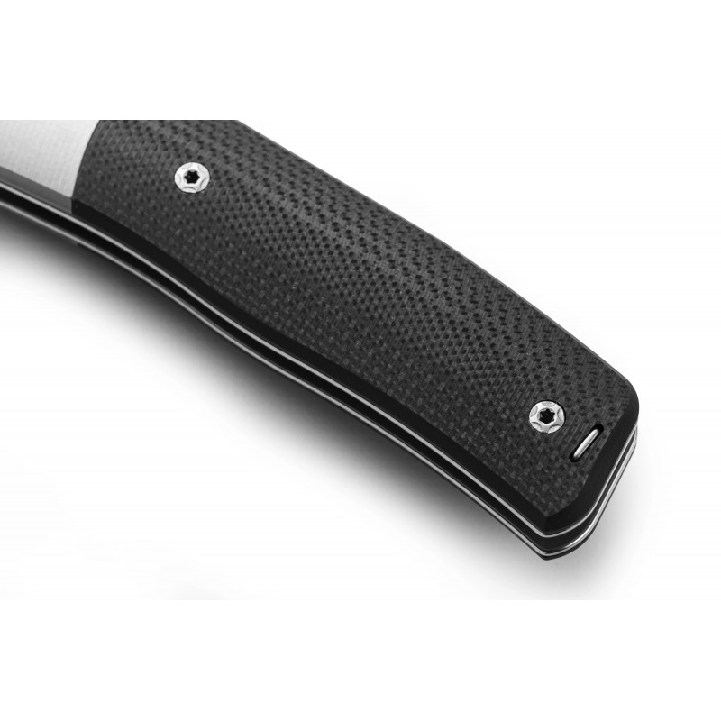 Il manico presenta una forma elegante ed ergonomica per una presa confortevole e un controllo senza sforzo. È disponibile in due varianti essenziali: con mostrina in Titanio sabbiato o senza, avendo quindi guancette più lunghe per tutta la lunghezza dei liner in acciaio inossidabile lucidato.