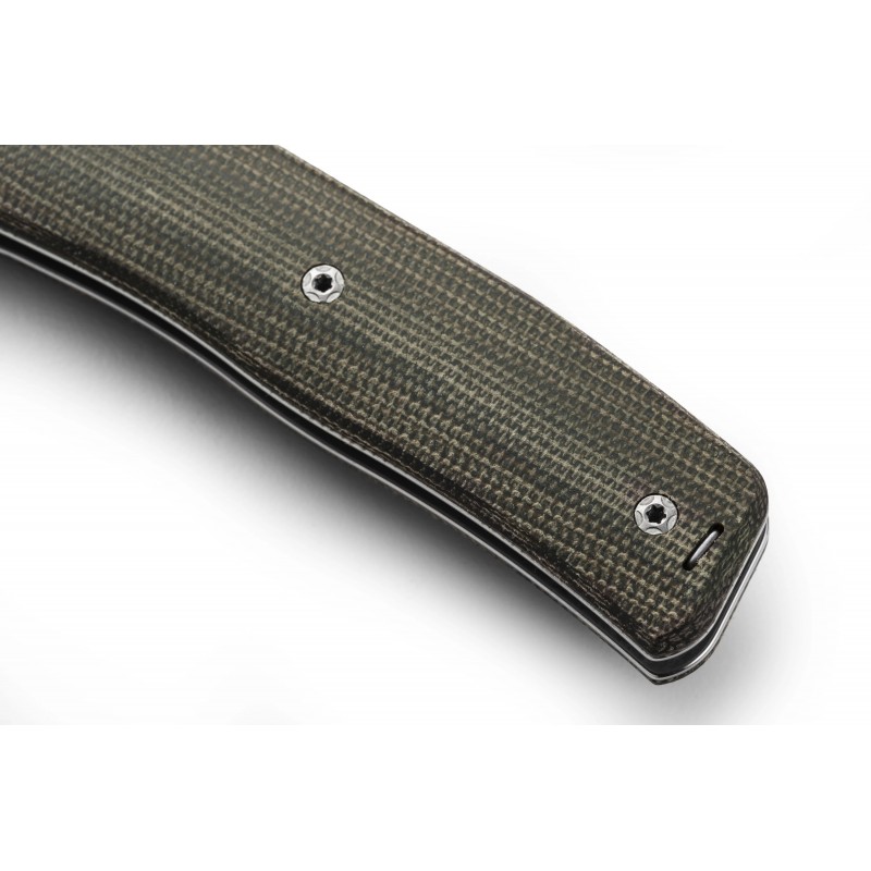Il manico presenta una forma elegante ed ergonomica per una presa confortevole e un controllo senza sforzo. È disponibile in due varianti essenziali: con mostrina in Titanio sabbiato o senza, avendo quindi guancette più lunghe per tutta la lunghezza dei liner in acciaio inossidabile lucidato.