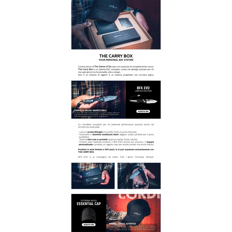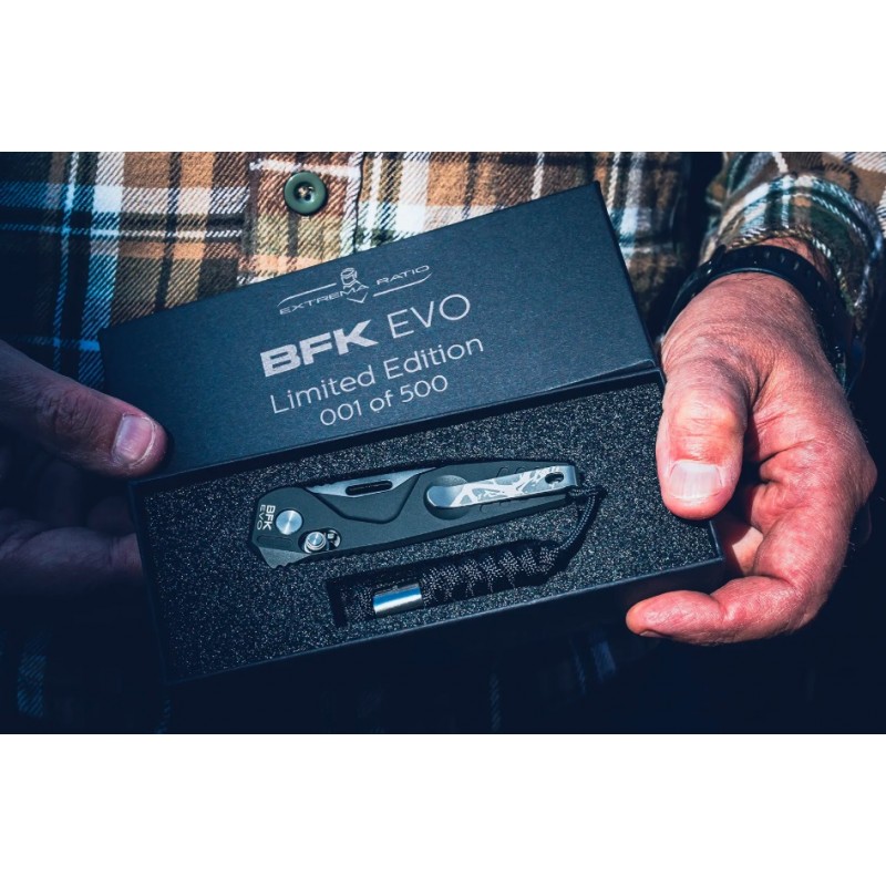 Il BFK EVO è un coltello chiudibile compatto studiato per essere il prodotto di punta per l’ingresso di Extrema Ratio nel mondo EDC. Prodotto in serie limitata a 500 pezzi, si può acquistare esclusivamente con THE CARRY BOX.