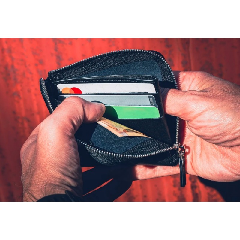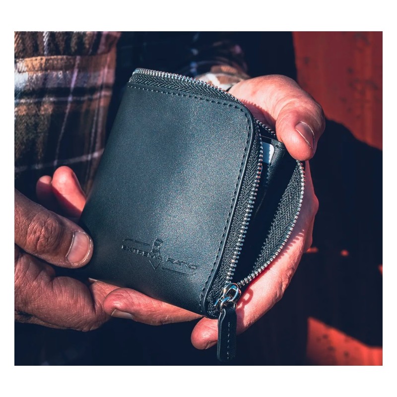 Portafoglio in pelle nera in stile Urban con chiusura a cerniera su tre lati e gancetto per agganciare un cordino da assicurare ai passanti dei pantaloni per evitare perdite accidentali o estrazioni indesiderate. Progettato per contenere tutto ciò che serve (carte di credito, banconote, ecc.), un accessorio che dura quanto gli strumenti Extrema Ratio, un tool da portare con sé ogni giorno.
